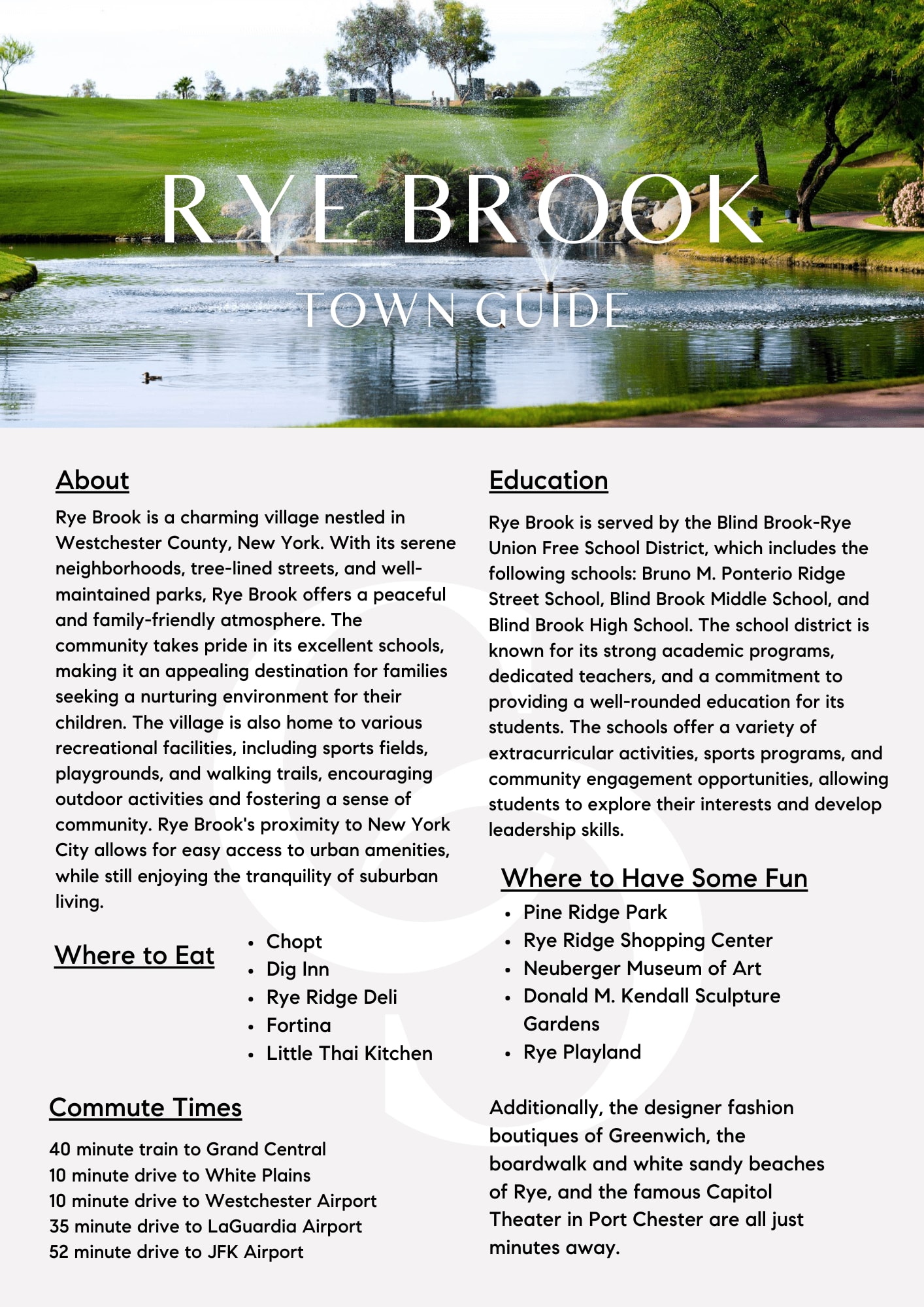 Since its formation in 1982, Rye Brook’s 3.5 beautiful square-miles along the New York-Connecticut border has attracted people looking for a small town feel with spectacular amenities. With everyday attractions like Pine Ridge Park and the “extended family” feel of this intimate community, Rye Brook offers a unique Westchester experience.